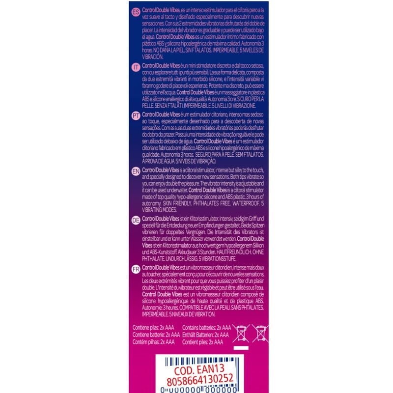 Con i suoi 2 arti vibranti godrai del doppio del piacere. L'intensità del vibratore è regolabile e può essere utilizzata sott'acqua. Control Double Vibes è uno stimolatore intimo realizzato con plastica ABS e silicone ipoallergenico di altissima qualità.