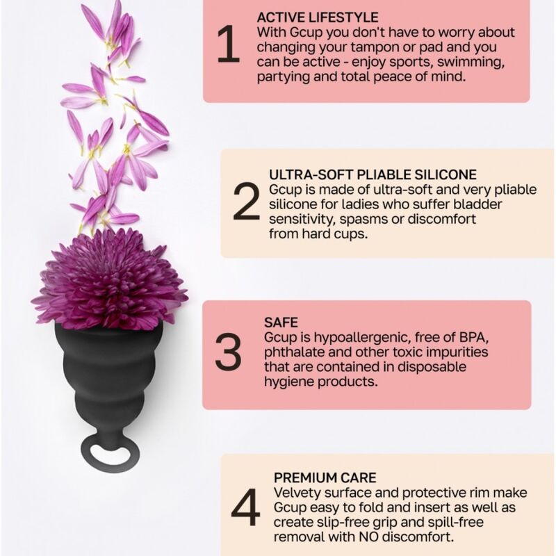 La coppetta mestruale Gcup è a forma di campana. Il vantaggio principale della Gcup è la valvola di ritegno interna. Grazie alla valvola, durante uno stile di vita attivo i liquidi non ritornano nella vagina. Puoi svolgere le tue attività quotidiane, fare sport e persino nuotare, dimenticandoti completamente di "questi giorni". La Gcup ha una superficie morbida e liscia, con la dimensione perfetta per non averne voglia. Inoltre, le ciotole risparmieranno una quantità significativa rispetto agli assorbenti e ai tamponi convenzionali. La coppetta mestruale Gcup è assolutamente sicura per la salute delle donne.